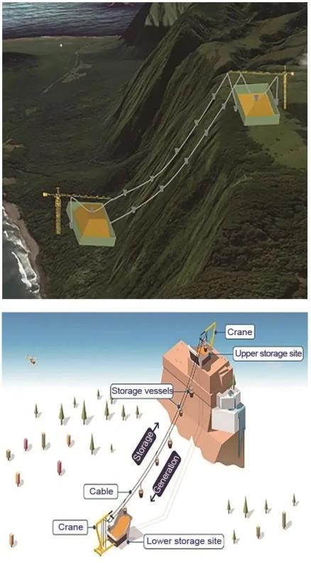 奧地利IIASA研究所2019年在Energy雜志上發(fā)表了一種山地纜繩索道結(jié)構(gòu)(圖9),纜繩吊起吊落重物進(jìn)行儲(chǔ)能和釋能。該儲(chǔ)能系統(tǒng)MGES(mountain gravity energy storage)由兩個(gè)平臺(tái)連接而成,每一個(gè)平臺(tái)都由一個(gè)類似礦山的砂礫儲(chǔ)存站和一個(gè)正下方的加砂站組成。閥門將沙石填放入筐內(nèi),然后通過起重機(jī)和電機(jī)電纜將其運(yùn)送到高海拔平臺(tái)。當(dāng)沙石被運(yùn)回山下時(shí),儲(chǔ)存的重力勢(shì)能被轉(zhuǎn)化為電能。與抽水蓄能電站等傳統(tǒng)的長(zhǎng)期蓄水方法相比,MGES對(duì)環(huán)境的影響很小。該系統(tǒng)儲(chǔ)能容量設(shè)計(jì)為0.5~20 MWh,發(fā)電功率500~5000 kW,儲(chǔ)能平準(zhǔn)化成本約為0.323~0.647元/kWh。這種儲(chǔ)能系統(tǒng)利用了天然山坡、使用砂礫作為儲(chǔ)能介質(zhì)可以減少建造成本,但纜車運(yùn)載能力較低,室外環(huán)境對(duì)纜車運(yùn)行影響較大,如何實(shí)現(xiàn)穩(wěn)定高效率的能量回收是此系統(tǒng)的研究難點(diǎn)。