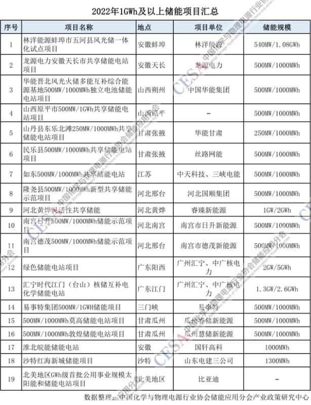 據(jù)中國(guó)儲(chǔ)能網(wǎng)不完全統(tǒng)計(jì),2022年1GWh及以上電化學(xué)儲(chǔ)能電站項(xiàng)目累計(jì)增加到19個(gè)(包括擬在建、招投標(biāo)及并網(wǎng)項(xiàng)目),其中國(guó)內(nèi)17個(gè),國(guó)外2個(gè)(沙特紅海新城儲(chǔ)能項(xiàng)目和比亞迪北美地區(qū)儲(chǔ)能項(xiàng)目)。
