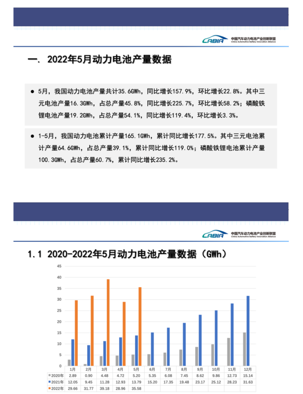 中國(guó)儲(chǔ)能網(wǎng)訊:2022年5月動(dòng)力電池月度數(shù)據(jù)發(fā)布如下。