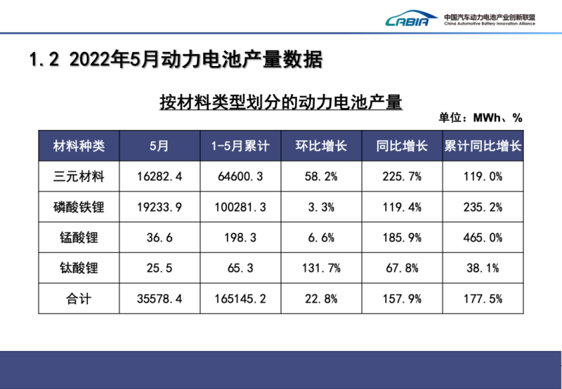 產(chǎn)量方面:2022年5月,我國(guó)動(dòng)力電池產(chǎn)量共計(jì)35.6GWh,同比增長(zhǎng)157.9%,環(huán)比增長(zhǎng)22.8%。其中三元電池產(chǎn)量16.3GWh,占總產(chǎn)量45.8%,同比增長(zhǎng)225.7%,環(huán)比增長(zhǎng)58.2%;磷酸鐵鋰電池產(chǎn)量19.2GWh,占總產(chǎn)量54.1%,同比增長(zhǎng)119.4%,環(huán)比增長(zhǎng)3.3%。2022年1-5月,我國(guó)動(dòng)力電池累計(jì)產(chǎn)量165.1GWh,累計(jì)同比增長(zhǎng)177.5%。其中三元電池累計(jì)產(chǎn)量64.6GWh,占總產(chǎn)量39.1%,累計(jì)同比增長(zhǎng)119.0%;磷酸鐵鋰電池累計(jì)產(chǎn)量100.3GWh,占總產(chǎn)量60.7%,累計(jì)同比增長(zhǎng)235.2%。