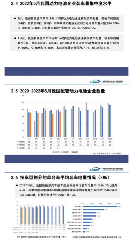 2022年5月,我國(guó)新能源汽車市場(chǎng)共計(jì)37家動(dòng)力電池企業(yè)實(shí)現(xiàn)裝車配套,較去年同期減少4家。排名前3家、前5家、前10家動(dòng)力電池企業(yè)動(dòng)力電池裝車量分別為14.2GWh、15.7GWh和17.4GWh,占總裝車量比分別為76.7%、84.5%和93.9%。2022年1-5月,我國(guó)新能源汽車市場(chǎng)共計(jì)43家動(dòng)力電池企業(yè)實(shí)現(xiàn)裝車配套,較去年同期減少8家,排名前3家、前5家、前10家動(dòng)力電池企業(yè)動(dòng)力電池裝車量分別為64.6GWh、70.8GWh和78.5GWh,占總裝車量比分別為77.7%、85.2%和94.4%。