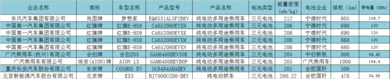 高工鋰電梳理2021-2022年已發(fā)布的《新能源汽車推廣應用推薦車型目錄》發(fā)現(xiàn),目前已有東風、一汽、廣汽、長安、北汽等多家主機廠申報了搭載系統(tǒng)能量密度超過200Wh/kg的純電動車型,配套電池企業(yè)為寧德時代、中創(chuàng)新航和國軒高科。