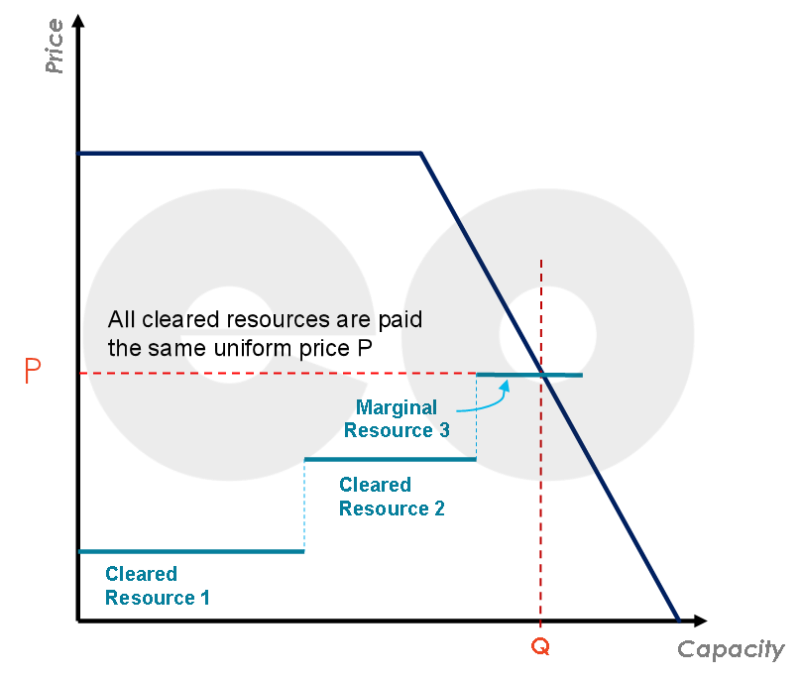 國際容量市場采用統(tǒng)一出清價格拍賣,所有取得資質(zhì)的資源每兆瓦容量獲得相同的邊際價格(圖3)。統(tǒng)一定價可以激勵供應(yīng)商以成本價供貨,這有助于確保以最低成本采購容量,并為投資和消費(fèi)提供有效的長期信號。