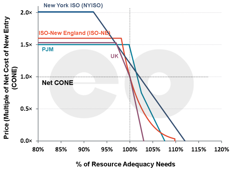 從早期的容量市場設(shè)計中得出的修改經(jīng)驗(yàn)是:使用向下傾斜的需求曲線,這能讓在資源充裕度要求附近的容量價格變得平穩(wěn)。當(dāng)容量充裕度降低,價格上升,發(fā)出激勵發(fā)電商投資的價格信號,但設(shè)置了價格上限確保價格波動不會過大;當(dāng)容量過剩,價格下降,降低新投資者進(jìn)入市場的熱情。圖2是國際容量市場使用的各種需求曲線,每一條都是根據(jù)其特定的市場條件量身定制的。