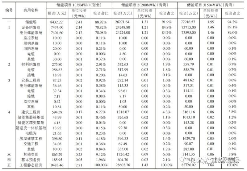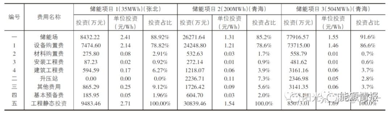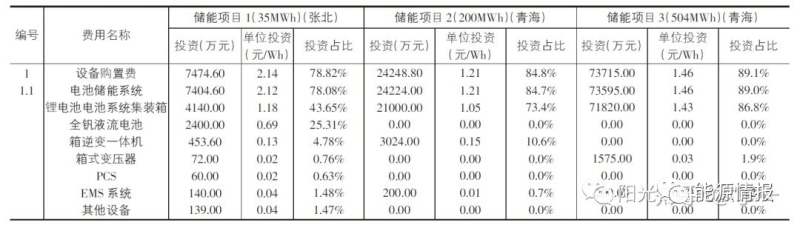 儲能項目1包含全釩液流電池,全釩液流電池設備價格約為鋰電池價格的2倍,因此該項目的單位投資較高,為2.71元/Wh。儲能項目2儲能場區(qū)部分單位投資為1.43元/Wh。儲能項目3儲能場區(qū)部分單位投資為1.64元/Wh。