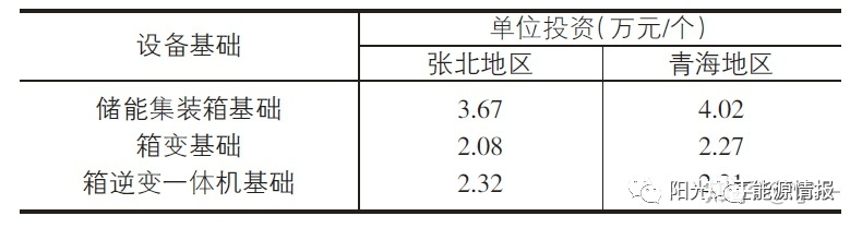 電池系統(tǒng)、箱變、箱逆變一體機均采用集裝箱形式,不同項目儲能電池集裝箱、儲能場區(qū)箱變基礎和箱逆變一體機基礎,單個基礎的工程量是相同的,根據(jù)張北地區(qū)和青海地區(qū)不同的價格水平,計算出單個設備基礎的造價指標如表4所示。