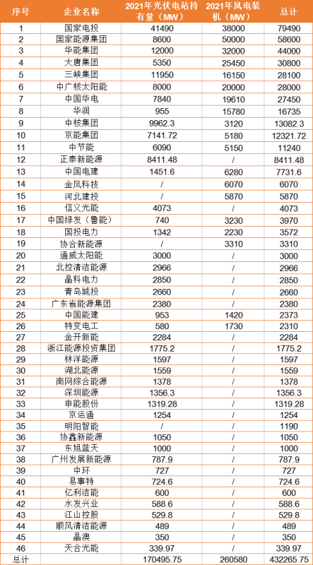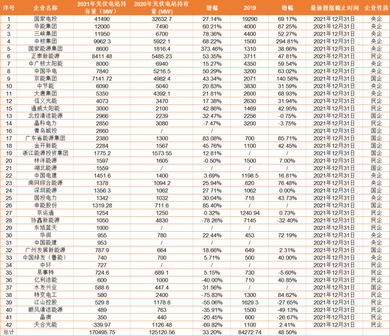 作為風(fēng)電、火電領(lǐng)域的“巨無霸”,國(guó)家能源集團(tuán)是2021年光伏電站增幅最高的企業(yè),年度光伏電站新增規(guī)模近7GW,其在光伏領(lǐng)域的投資力度正持續(xù)增強(qiáng)。事實(shí)上,國(guó)家能源集團(tuán)在光伏領(lǐng)域投資啟動(dòng)較晚,過去兩年,國(guó)家能源集團(tuán)光伏總裝機(jī)不足2GW。但隨著“雙碳目標(biāo)”的提出,國(guó)家能源集團(tuán)提出了“十四五”期間50GW的光伏新增規(guī)劃,年新增規(guī)模10GW/年。去年,國(guó)家能源集團(tuán)發(fā)力光伏投資開發(fā),鎖定風(fēng)光大基地13.9GW,整縣光伏開發(fā)提出了到今年不低于500縣的要求。近日,國(guó)家能源集團(tuán)舉行了2022年電力項(xiàng)目開工儀式,預(yù)計(jì)其今年新能源開工超過20GW、投產(chǎn)15GW。
