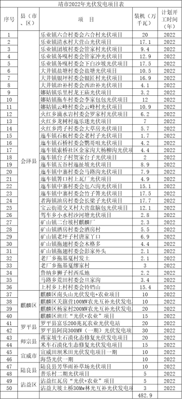 根據(jù)文件顯示,曲靖市2022年光伏發(fā)電項(xiàng)目合計(jì)50個(gè)光伏項(xiàng)目,總裝機(jī)482.9萬(wàn)千瓦,其中會(huì)澤縣36個(gè)299.9 萬(wàn)千瓦、麒麟?yún)^(qū)4個(gè)55萬(wàn)千瓦、羅平縣2個(gè)50萬(wàn)千瓦、師宗縣2個(gè)35萬(wàn)千瓦、宣威市2個(gè)20萬(wàn)千瓦、陸良縣2個(gè)15萬(wàn)千瓦、沾益區(qū)2個(gè)8萬(wàn)千瓦。