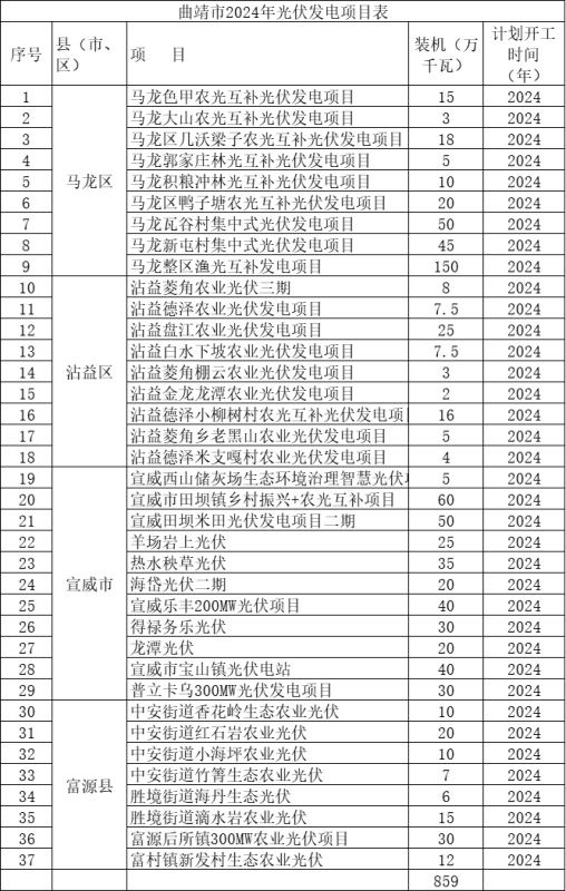曲靖市2024年光伏發(fā)電項(xiàng)目合計(jì)光伏項(xiàng)目37個(gè),總裝機(jī)859萬(wàn)千瓦,其中馬龍區(qū)9個(gè)316萬(wàn)千瓦、沾益區(qū)9個(gè)78萬(wàn)千瓦、宣威市11個(gè)355萬(wàn)千瓦、富源縣8個(gè)110萬(wàn)千瓦(三年項(xiàng)目具體名單看附件)。