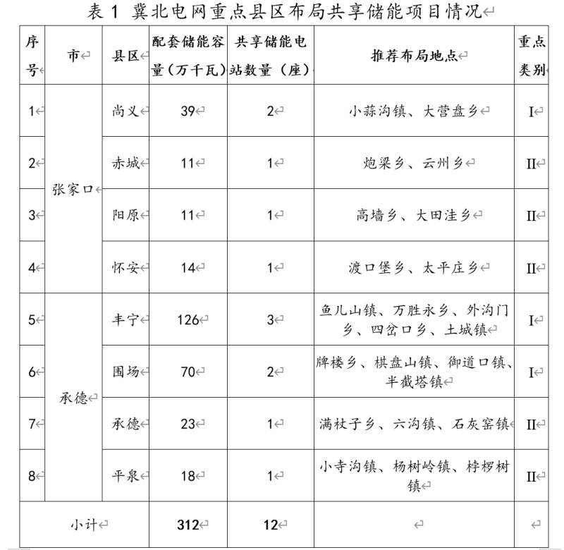 (一)I類(lèi)縣區(qū)布局。按照集約化、共享化要求布局共享儲(chǔ)能項(xiàng)目。經(jīng)對(duì)全省新能源裝機(jī)規(guī)模及配套儲(chǔ)能建設(shè)需求測(cè)算,I類(lèi)縣區(qū)共3個(gè),包括尚義、圍場(chǎng)、豐寧,每個(gè)縣區(qū)可布局2—3個(gè)共享儲(chǔ)能電站,每座儲(chǔ)能電站建設(shè)規(guī)模不低于10萬(wàn)千瓦、不高于30萬(wàn)千瓦(見(jiàn)表圖)。其余按配套儲(chǔ)能單獨(dú)建設(shè)。