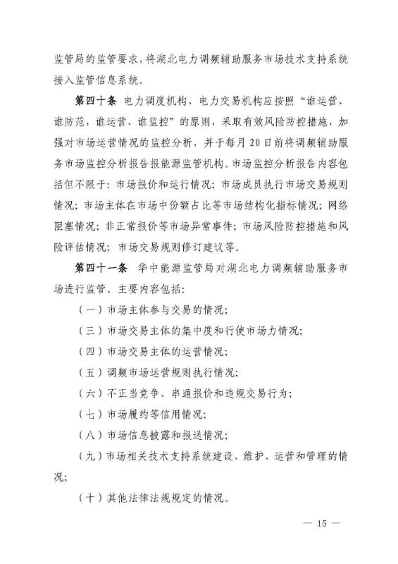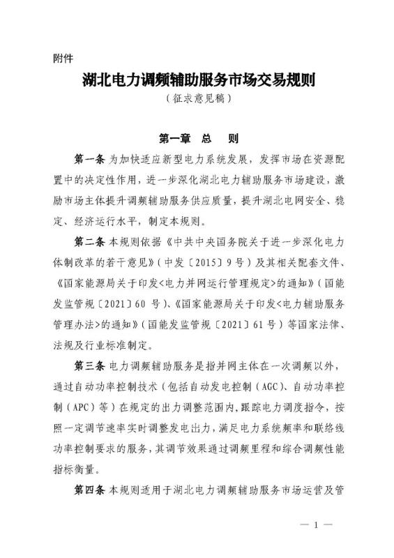 華中能源監(jiān)管局關(guān)于《湖北電力調(diào)頻輔助服務(wù)市場(chǎng)交易規(guī)則(征求意見稿)》公開征求意見的通知