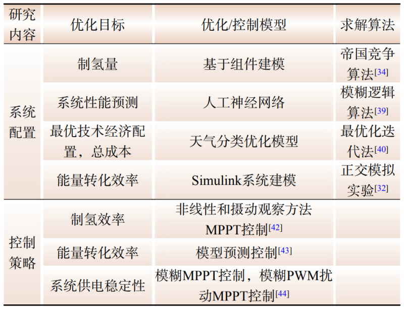 近年來,風(fēng)光互補發(fā)電耦合氫儲能系統(tǒng)容量配置與控制優(yōu)化研究總結(jié)如表1所示。合理的容量配置不僅能保證各裝置單元高效協(xié)同運行,而且最大限度地降低成本。文獻[39]將基于模糊邏輯算法的人工神經(jīng)網(wǎng)絡(luò)算法應(yīng)用于系統(tǒng)的容量優(yōu)化配置,獲得了較好的系統(tǒng)性能預(yù)測準(zhǔn)確性。文獻[40]運用迭代最優(yōu)化的方法確定系統(tǒng)的最優(yōu)技術(shù)經(jīng)濟配置和總成本,證明了風(fēng)光互補發(fā)電混合系統(tǒng)與化石燃料相比在成本和效率方面有一定優(yōu)勢。文獻[41]通過實驗仿真和數(shù)據(jù)分析指出,基于當(dāng)?shù)氐奶鞖鈹?shù)據(jù)及環(huán)境特征進行風(fēng)力、太陽能發(fā)電和儲能等模塊的容量配置設(shè)計,才能更好地挖掘風(fēng)能和太陽能的開發(fā)利用潛力,并結(jié)合河北省的太陽能和風(fēng)能資源,分析了風(fēng)光互補發(fā)電耦合氫儲能系統(tǒng)在河北省不同地區(qū)的適用性。