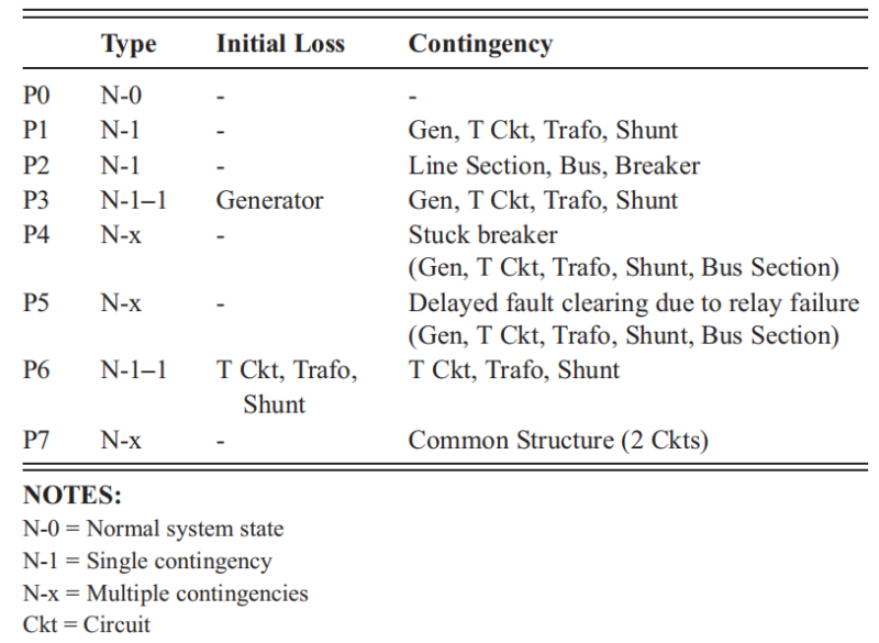 輸電網(wǎng)規(guī)劃必須符合最低的性能標(biāo)準(zhǔn),例如北美的 NERC TPL-001-4。性能要求確保在規(guī)劃范圍內(nèi),大容量電力系統(tǒng) (BES) 將在廣泛的系統(tǒng)條件下可靠運(yùn)行,并遵循表 1.1 中總結(jié)的各種可能的突發(fā)事件。根據(jù) NERC TPL-001-4 標(biāo)準(zhǔn)的應(yīng)急分類可以總結(jié)如下:P0 是完整系統(tǒng)(N-0);P1為單一元件失效(電路、發(fā)電機(jī)、變壓器、分流裝置);P2也是單一元件失效(線路分段、母線、斷路器);P3是發(fā)電機(jī)失效一段時(shí)間后第二個(gè)元件失效(N-1-1),P4是多元件失效(斷路器拒動(dòng)),P5也是多元件失效(繼電保護(hù)故障清除延遲)失效); P6 是單個(gè)元件(線路、變壓器、分流裝置)失效后的另一個(gè)單個(gè)元件(N-1-1)失效,P7 是多個(gè)元件(一般結(jié)構(gòu))的失效。