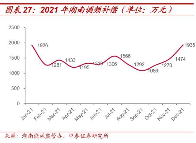 調頻補償規(guī)模小于調峰。以甘肅省為例,根據甘肅能監(jiān)辦數據,2021 年 5-12 月調頻補償總額為 1.06 億元;根據國家統計局數據,同期甘肅 發(fā)電量為 1136 億 kWh,按燃煤標桿電價 0.2978 元/kWh 計算電費,調 頻補償占電費的比重為 0.31%。相同方式計算湖南省數據,2021 年調 頻補償總額為 1.71 億元,調頻補償占電費的比重為 0.23%。隨著新能 源并網比例的提升,調頻費用規(guī)模有望進一步增長。