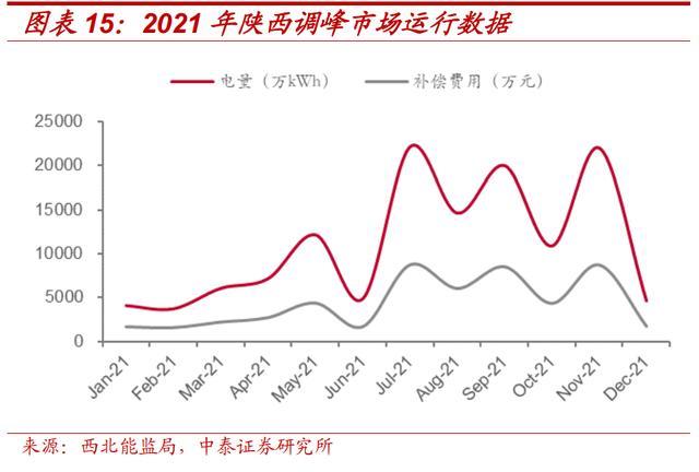 參考陜西和寧夏調峰市場運行情況,調峰費用已占電費一定比例。根據西北能監(jiān)局數據,2021 年全年陜西省內調峰電量 13.23 億 kWh,調 峰補償 5.19 億元,調峰均價為 0.39 元/kWh;寧夏省內調峰電量 8.83 億 kWh,調峰補償 5.32 億元,調峰均價為 0.60 元/kWh。2021 年兩省發(fā)電量分別為 2615 和 2007 億 kWh,按燃煤 標桿電價陜西 0.3545 元/kWh、寧夏 0.2595 元/kWh 計算,調峰費用分 別占兩省上網電費的 0.56%和 1.02%。隨著新能源并網比例的提升, 調峰電量和費用規(guī)模有望進一步增長。