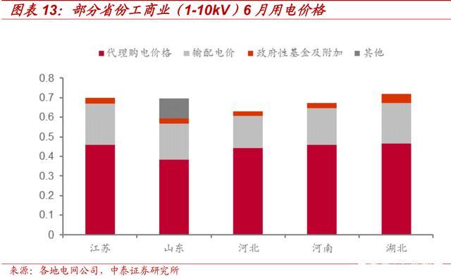 加快推動儲能配合電網調峰,明確儲能充電不計輸配電價。此前,關 于儲能充電是否需承擔輸配電價等費用,各地沒有明確統一的標準。 《通知》特別指出,獨立儲能電站向電網送電的,其相應充電電量不承 擔輸配電價和政府性基金及附加,這一規(guī)定將大幅降低儲能充電成本。 我們統計了部分省份 2022 年 6 月代理購電的用電價格,輸配電價和政 府性基金及附加合計占用電價格的比例超過 30%,以江蘇省為例,代 理購電價格、輸配電價、政府性基金及附加分別為 0.4594、0.2110、 0.0294 元/kWh,輸配電價及政府性基金占用電價格比例為 34.35%。 若儲能充電需支付這兩部分費用,將大幅提高充電成本,因此這一規(guī)定 將明確儲能項目邊界條件,保障儲能合理收益,提高儲能投資意愿。
