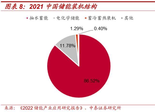 相比抽水蓄能,電化學儲能更加靈活。2021 年中國抽水蓄能裝機功率 38GW,占比全部儲能的 86.52%,電化學儲能裝機功率 5GW,占比 11.78%,抽水蓄能是我國存量儲能的主要形式。2021 年中國新增抽水 蓄能裝機 5GW,占比 71.14%,電化學儲能新增 2GW,占比 24.94%, 電化學儲能裝機增速超過抽水蓄能。抽水蓄能需要尋找合適地形及水域, 同時可能涉及搬遷移民問題,外部限制因素較多,建設期通常長達數年。 我國水電資源主要集中在南方地區(qū)尤其是西南地區(qū),西北等地區(qū)缺發(fā)建 設大型抽蓄配套新能源的條件。而電化學儲能則對外界條件要求不高, 建設期較短,單體投資小,因而成為新能源配儲的普遍選擇。
