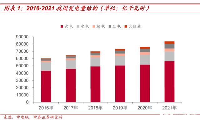 “雙碳”目標推動電力系統轉型。2022 年 4月,國家發(fā)改委發(fā)布文章 《完善儲能成本補償機制,助力構建以新能源為主體的新型電力系統》, 提出在“雙碳”目標背景下,我國電力系統將向以新能源為主體的新型電 力系統轉型,儲能作為靈活調節(jié)電源在新型電力系統中承擔重任。 新能源裝機及發(fā)電量比例不斷上升。截至 2021 年,我國風電裝機規(guī)模 328.48GW,光伏裝機規(guī)模 306.56GW。2021 年風電發(fā)電量為 6556 億 千瓦時,占比 7.83%,太陽能發(fā)電量 3270 億千瓦時,占比 3.91%,發(fā) 電量合計占比 11.74%,較 2016 年的 5.10%提升 6.64pct。