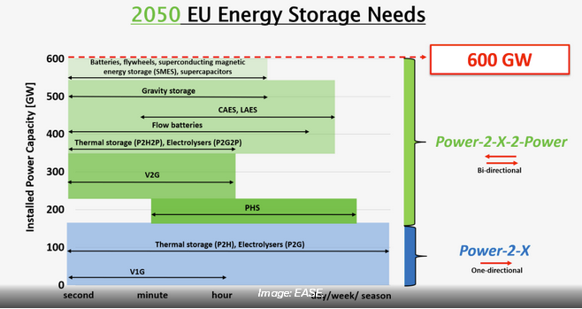 該協(xié)會(huì)在其報(bào)告中將2050年600GW儲(chǔ)能系統(tǒng)部署目標(biāo)分為兩個(gè)部分。435GW儲(chǔ)能系統(tǒng)需要來(lái)自“Power-to-X-to-Power”解決方案,而剩余的165GW可以通過(guò)提供單向系統(tǒng)靈活性的“power-to-X”技術(shù)提供。