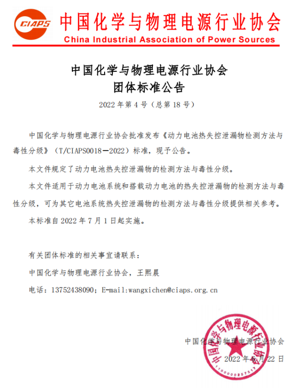 中國化學(xué)與物理電源行業(yè)協(xié)會批準(zhǔn)發(fā)布《動力電池?zé)崾Э匦孤┪餀z測方法與毒性分級》(T/CIAPS0018―2022)標(biāo)準(zhǔn),現(xiàn)予公告。