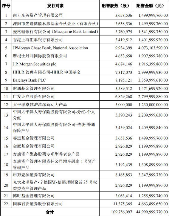 6月22日晚,寧德時(shí)代(SZ300750,股價(jià)507.00元,市值1.18萬(wàn)億元)發(fā)布公告稱(chēng),本次定增的發(fā)行價(jià)格最終為410元/股,共募集資金總額約為450億元,扣除各項(xiàng)發(fā)行費(fèi)用(不含增值稅)后,實(shí)際募集資金凈額人民幣448.7億元。共有22家投資者獲配。其中,國(guó)泰君安、J.P.Morgan Chase Bank、Barclays Bank Plc分別以46.6億元、40.7億元和33.6億元排在本次配售金額的前三位。