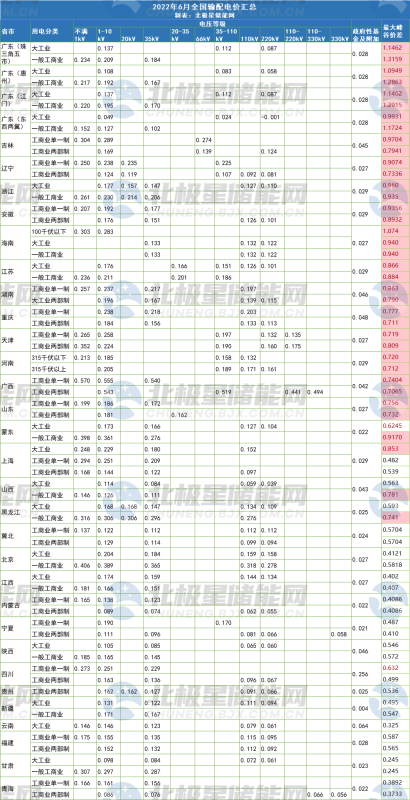 根據(jù)2022年6月全國(guó)各地電網(wǎng)企業(yè)代理購(gòu)電價(jià)格,北極星儲(chǔ)能網(wǎng)梳理了全國(guó)各地110kV大工業(yè)電價(jià)兩部制電價(jià)中的輸配電價(jià)和政府性基金及附加發(fā)現(xiàn),每個(gè)省份的輸配電價(jià)并不一致,并且根據(jù)當(dāng)?shù)厍闆r與季節(jié)會(huì)發(fā)生波動(dòng)。