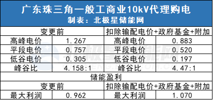 以廣東珠三角地區(qū)為例,一般工商業(yè)10kV輸配電價(jià)0.2094元/kWh,政府性基金及附加0.0276元/kWh,如果相應(yīng)充電電量不承擔(dān)輸配電價(jià)和政府性基金及附加,則平段電價(jià)達(dá)到0.5197元/kWh,與此同時(shí),高峰低谷電價(jià)按當(dāng)?shù)卣弑壤齽t變成0.883元/kWh、0.197元/kWh。電價(jià)峰谷比由原來(lái)的4.158:1,變成4.47:1,峰谷比拉大。