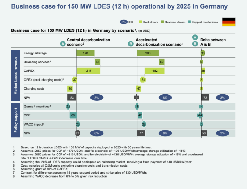 長時儲能理事會展示了這些工具在實踐中的使用方法,包括一個理論上的商業(yè)案例——在德國2025年投運(yùn)的150MW、12小時解決方案,如下圖所示。