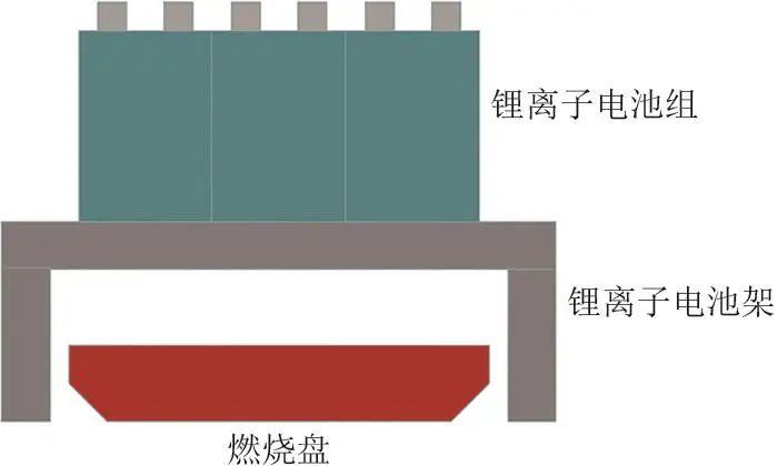 除加熱之外,通過外焰直接對電池進行點火也是電池燃燒試驗中經(jīng)常使用的引燃方式。這種方法的優(yōu)勢在于電池一旦出現(xiàn)泄氣行為會即刻被點燃,避免了出現(xiàn)爆炸的風(fēng)險,且更有效地使電池進入燃燒的狀態(tài)。但由于火焰的內(nèi)外焰溫度并不完全一致,且灼燒面無法覆蓋整塊電池,導(dǎo)致電池受熱并不均勻,對熱失控的初期升溫階段可能會造成干擾。因此這種點燃觸發(fā)熱失控的方法更適合用于需要電池進入燃燒狀態(tài)的實驗,如關(guān)于消防策略、滅火劑等方向的研究。Li等在研究18650鈷酸鋰電池串并聯(lián)電池組燃燒及滅火特性的實驗中采用了明火引燃電池的方法。他們將一個裝有正庚烷的燃燒盆子置于電池架的底部(見圖6),隨后點燃燃燒盤,讓盤中的火焰灼燒置于電池架上的鋰離子電池直至電池進入熱失控狀態(tài)。但由于燃燒盤的火焰無法控制自行熄滅,當(dāng)鋰離子電池進入燃燒狀態(tài)后,盤內(nèi)的火焰依然存在,對實驗的可靠性造成了一定程度的影響。為了避免外焰對后續(xù)電池的燃燒行為造成影響,可以從以下兩種思路進行改進:①通過使用本生燈之類的設(shè)備,當(dāng)電池進入燃燒狀態(tài)后手動關(guān)閉燃料的輸送,使點火設(shè)備停止工作;②搭建機械控制裝置,在電池進入燃燒狀態(tài)后自動將外焰設(shè)備從電池附近移開。