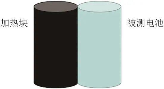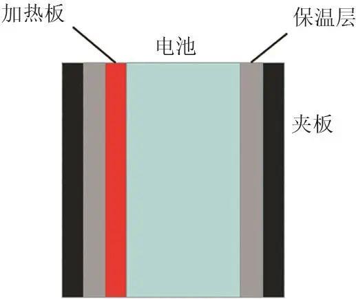 通過安置加熱塊對鋰離子電池進行加熱是最為常見的熱濫用方式,可以人為控制鋰離子電池?zé)崾Э爻跗诘臏囟茸兓厔莺蜏厣俾?,有效地對熱量累積階段的結(jié)構(gòu)及理化性質(zhì)的變化進行觀測,為智能消防系統(tǒng)中熱失控前期的變化模型提供數(shù)據(jù)支撐。Zhang等采用加熱方式誘導(dǎo)4 Ah的圓柱形電池進入熱失控。他們將一個與電池形狀相同的加熱塊與被測電池并排放置,如圖4所示,通過300 W的加熱塊將熱量傳遞給緊密接觸的被測電池。在加熱模塊中還加入了機械結(jié)構(gòu)的設(shè)計,當(dāng)電池進入泄氣階段時即移開加熱塊,防止加熱塊的熱量對電池產(chǎn)熱情況造成干擾,影響數(shù)據(jù)的可靠性。Mao等同樣采用加熱塊誘發(fā)300 Ah的鋰離子電池的熱失控,從而對燃燒行為進行研究。研究中采用的是帶殼體的方形電池,需要用夾板將電池與加熱板緊密貼合,如圖5所示。但為了保證加熱板與電池的緊密貼合,在該機構(gòu)的設(shè)計中采用了夾具將加熱板、電池等部件固定,導(dǎo)致電池在出現(xiàn)電池泄氣行為后加熱板不便于移開,所以采用對加熱板斷電的方式減少額外熱量對鋰離子電池?zé)崾Э睾罄m(xù)行為的干擾。