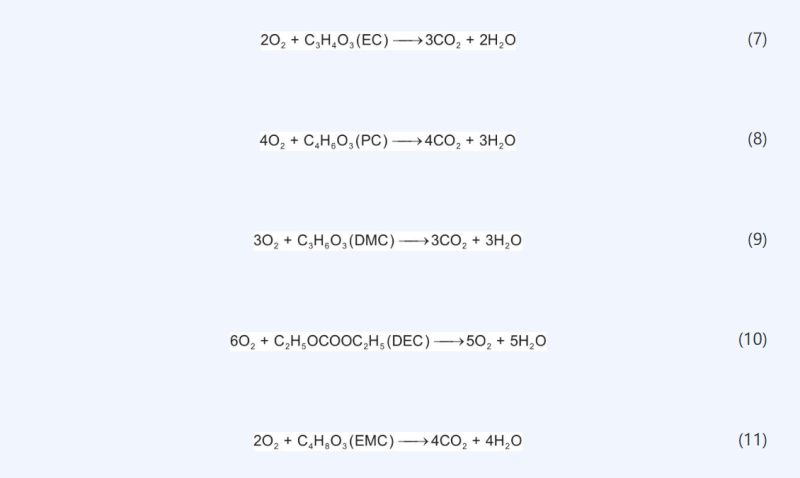 當(dāng)溫度繼續(xù)升高到130~180 ℃區(qū)間時,隔膜融化,電池將出現(xiàn)內(nèi)短路,產(chǎn)生大量的焦耳熱,此時電池自發(fā)產(chǎn)熱,進入熱失控狀態(tài)。值得注意的是,此時電池內(nèi)部產(chǎn)生熱量以及產(chǎn)生的速率與電池荷電狀態(tài)(state of charge,SOC)成正相關(guān)。當(dāng)溫度達到200 ℃以上時,正極材料開始發(fā)生劇烈的分解反應(yīng),產(chǎn)生大量的熱并釋放出氧氣,這些氧氣還將和電解質(zhì)發(fā)生如下反應(yīng),進一步放出大量的熱。