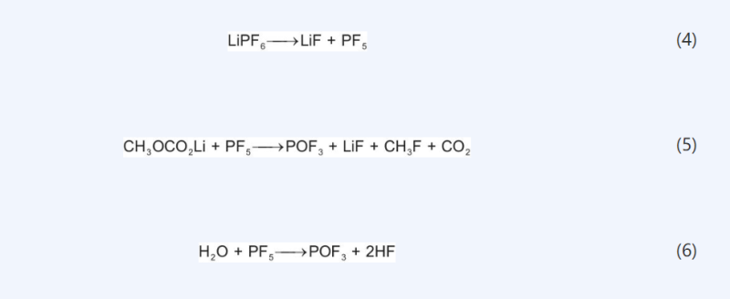 在此溫度下,電解質(zhì)中的鹽還會發(fā)生熱解與水解,生成PF5、POF3、CH3F和HF等有毒害氣體,反應(yīng)如下