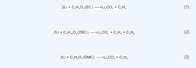 為了更深入地研究鋰離子電池?zé)崾Э厍闆r,研究人員在這三個階段的基礎(chǔ)上進一步細化,對電池?zé)崾Э氐娜^程進行了更細致的劃分。當(dāng)電池溫度僅處于60~80 ℃時,輕微的產(chǎn)氣行為就已經(jīng)開始發(fā)生,當(dāng)溫度達到90 ℃時,固態(tài)電解質(zhì)界面膜SEI(solid electrolyte interphase)發(fā)生重構(gòu)。當(dāng)溫度進一步提高到100~140 ℃,SEI膜結(jié)構(gòu)開始被破壞,發(fā)生分解反應(yīng)。在此階段,由于SEI膜被破壞導(dǎo)致Li負極與電解質(zhì)發(fā)生直接接觸,在高溫情況下會產(chǎn)生乙烯和乙烷等可燃性氣體,進一步破壞電極結(jié)構(gòu),加劇副反應(yīng),反應(yīng)方程式如下