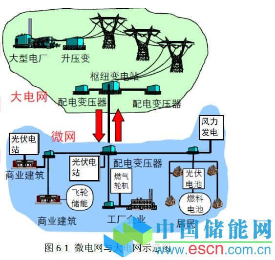 所謂“微電網(wǎng)”,是指采用光伏發(fā)電作為白天的主要供電電源,同時(shí)利用其它能夠與光伏互補(bǔ)的各種可再生能源的同時(shí)接入來滿足不同氣候條件下的電力供應(yīng),利用儲(chǔ)能系統(tǒng)和包括微型燃?xì)廨啓C(jī)等清潔能源作為供電的調(diào)節(jié)手段,通過先進(jìn)的自動(dòng)控制技術(shù)和信息網(wǎng)絡(luò)技術(shù)實(shí)現(xiàn)網(wǎng)內(nèi)的智能控制和網(wǎng)間的遠(yuǎn)程調(diào)度,直接對(duì)供電區(qū)域內(nèi)部的用戶負(fù)荷直接供電的電網(wǎng)。所謂“微”,指的是與現(xiàn)有國(guó)家電網(wǎng)相比的,并非指容量小于某個(gè)具體的值。微電網(wǎng)同時(shí)也可以與公用電網(wǎng)相連(見圖6-1)。