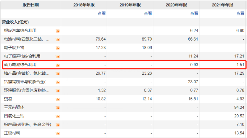 但是公司精心布局近六年的動力電池回收業(yè)務(wù)占比不足1%?拆分2021年公司營收占比,公司動力電池回收業(yè)務(wù)營業(yè)收入1.51億元,同比增長61.63%,卻僅占總營收的0.78%。
