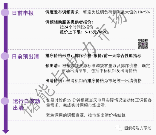調(diào)頻市場(chǎng)按照“日前報(bào)價(jià)預(yù)出清、日內(nèi)滾動(dòng)出清”的組織方式開(kāi)展,相關(guān)流程如下。