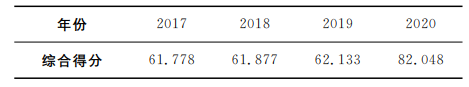 根據(jù)各項指標得分,計算可得評價對象歷年最終得分,從綜合得分來看,該工程前3年得分較低,但2020年得分顯著提高,達到822.048分,這主要是2017~2019年間,多能源協(xié)調(diào)控制設備正處于準備建設階段,尚未投入使用,綜合多能源利用系統(tǒng)正處于搭建階段,許多預測協(xié)調(diào)控制功能尚未實現(xiàn),因而綜合評價得分偏低。