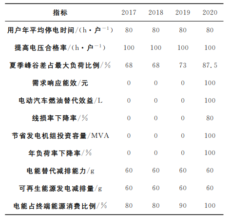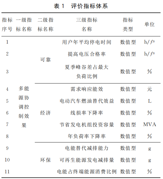 智慧能源多級調(diào)控的效果是從安全可靠、優(yōu)質(zhì)經(jīng)濟和節(jié)能環(huán)保等方面進行評價的。安全可靠主要是指電力系統(tǒng)運行的穩(wěn)定性,具體表現(xiàn)為電力系統(tǒng)在故障時間內(nèi)停電范圍以及停電時間、削峰填谷的響應效果;優(yōu)質(zhì)經(jīng)濟主要是指系統(tǒng)在運行期間電能質(zhì)量以及系統(tǒng)的運行成本,主要能夠以可再生能源技術(shù)電網(wǎng)的并網(wǎng)水平以及系統(tǒng)總成本進行量化;節(jié)能環(huán)保是指整個系統(tǒng)的碳排放水平一級節(jié)能減排效果,主要可以利用可再生能源發(fā)電以及電動汽車保有量水平進行環(huán)境影響效果評價。