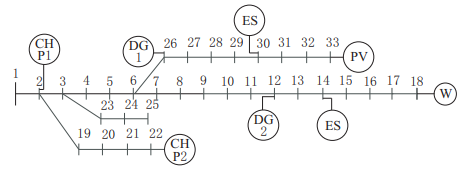 本文選取某工程仿真,該工程基于IEEE 33節(jié)點系統(tǒng)進行仿真分析,為反映其多級能源的動態(tài)變化,選擇4年連續(xù)評價。本文考慮柴油機組(DG)、光伏太陽能機組(PV)、風機(W)、熱電聯(lián)產(chǎn)系統(tǒng)(CHP)以及電池儲能系統(tǒng)(ES)。