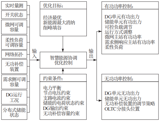 在控制模型中,主要包括發(fā)電側(cè)、網(wǎng)絡拓撲結(jié)構(gòu)層面、用戶側(cè)以及其他可再生能源發(fā)電設備。通過多種傳感設備,對能源綜合協(xié)調(diào)優(yōu)化控制模型進行數(shù)據(jù)輸入,最終根據(jù)預定的輸出進行模型控制。