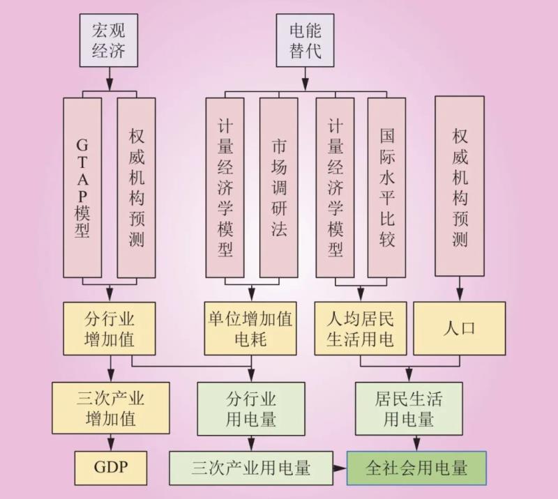 采用中長期分部門電力需求預測模型,原理如圖4所示。充分考慮宏觀經(jīng)濟、電能替代等影響,采用GTAP (global trade analysis project)、計量經(jīng)濟學、國際水平比較、市場調研、參考權威機構等方法,預測“十四五”期間中國分行業(yè)增加值、單位增加值電耗、人均居民生活用電量、人口等中間變量,并按照部門屬性匯總得到中國全社會和三次產(chǎn)業(yè)用電量預測結果[23-27]。