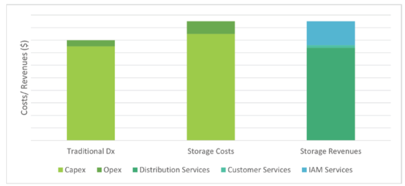 如圖1所示,相對于儲能系統(tǒng)來說,傳統(tǒng)配電設施投資的前期成本可能較低,但如果實現(xiàn)了安大略省獨立電力系統(tǒng)運營商(IESO)管理的批發(fā)市場(IAM)和其他服務的收入抵消,那么儲能資產的凈成本也可能低于傳統(tǒng)配電投資。