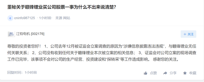 對(duì)此,江特電機(jī)7月4日早盤中在互動(dòng)平臺(tái)表示,公司去年12月被證監(jiān)會(huì)立案調(diào)查的原因?yàn)椤吧嫦有畔⑴哆`法違規(guī)”,與贛鋒鋰業(yè)無任何關(guān)聯(lián)關(guān)系;公司沒有收到任何關(guān)于贛鋒鋰業(yè)本次被立案的相關(guān)信息;證監(jiān)會(huì)對(duì)公司立案的現(xiàn)場(chǎng)調(diào)查工作已完畢,該事項(xiàng)不會(huì)對(duì)公司的生產(chǎn)經(jīng)營(yíng)、投資建設(shè)和“探轉(zhuǎn)采”等工作造成影響。