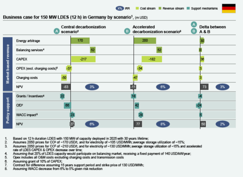 更加雄心勃勃的脫碳目標(biāo)和更快的成本下降提高了凈現(xiàn)值(NPV),并使內(nèi)部回報(bào)率(IRR)翻倍。隨著德國(guó)脫碳議程的加速(即從當(dāng)前軌跡轉(zhuǎn)向已經(jīng)實(shí)現(xiàn)的承諾),更積極的脫碳目標(biāo)和長(zhǎng)時(shí)儲(chǔ)能(LDES)成本下降假設(shè),凈現(xiàn)值(NPV)有所改善但仍為負(fù)數(shù)(虧損1000萬(wàn)美元),內(nèi)部收益率(約6%)接近假設(shè)的加權(quán)平均資本成本(WACC)(6%)。