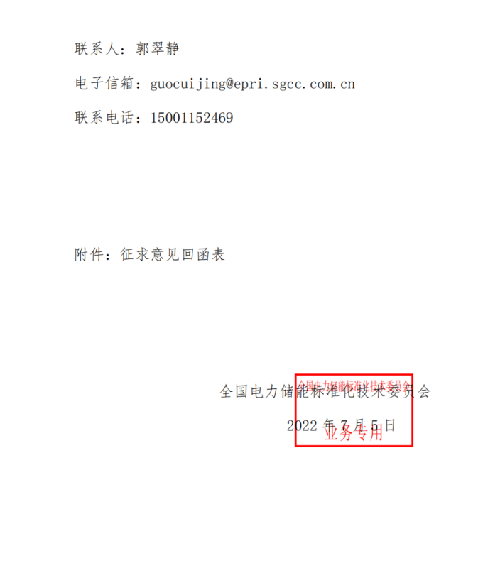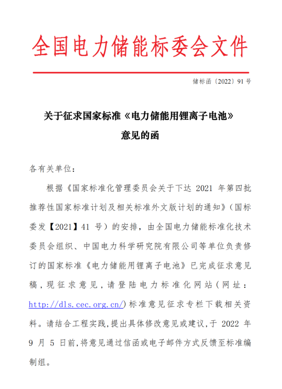關(guān)于征求國家標(biāo)準(zhǔn)《電力儲能用鋰離子電池》意見的函