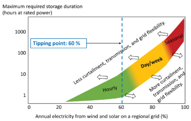 圖4:Y軸顯示了確保滿足需求所需最長的儲(chǔ)能持續(xù)時(shí)間(對(duì)數(shù)標(biāo)度)與區(qū)域/地方層面的可再生能源發(fā)電設(shè)施(風(fēng)電和太陽能)的年度能源比例。箭頭表示限電、輸電和電網(wǎng)靈活性的保守(左側(cè))或激進(jìn)(右側(cè))的假設(shè)