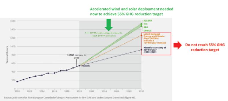 圖3 到2030年歐盟實(shí)現(xiàn)55%碳排放目標(biāo)所需增長的風(fēng)力發(fā)電量和太陽能發(fā)電量