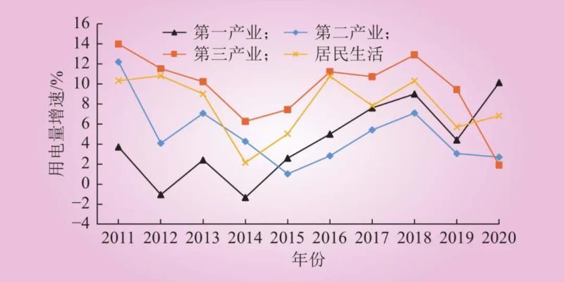 Fig.3 Growth rate of electricity consumption of three industries and residents since 2011