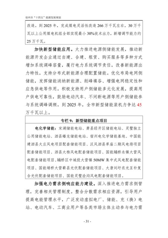 中國(guó)儲(chǔ)能網(wǎng)訊:7月7日,宿州市發(fā)改委發(fā)布《宿州市“十四五”能源發(fā)展規(guī)劃(征求意見(jiàn)稿)》。規(guī)劃中提出加快新型儲(chǔ)能應(yīng)用。大力推進(jìn)電源側(cè)儲(chǔ)能發(fā)展,推動(dòng)新能源開(kāi)發(fā)企業(yè)通過(guò)自建、合建、租賃、購(gòu)買(mǎi)服務(wù)等多種方式增加系統(tǒng)調(diào)峰容量,履行電力系統(tǒng)調(diào)節(jié)責(zé)任,改善新能源出力特性,支持分布式新能源合理配置儲(chǔ)能。優(yōu)化布局電網(wǎng)側(cè)儲(chǔ)能,發(fā)揮儲(chǔ)能消納新能源、削峰填谷、增強(qiáng)電網(wǎng)穩(wěn)定性和應(yīng)急供電等作用。積極支持用戶側(cè)儲(chǔ)能多元化發(fā)展,提高用戶供電可靠性,鼓勵(lì)電動(dòng)汽車(chē)、不間斷電源等用戶側(cè)儲(chǔ)能參與系統(tǒng)調(diào)峰調(diào)頻。到2025年,全市新型儲(chǔ)能裝機(jī)力爭(zhēng)達(dá)45萬(wàn)千瓦以上。