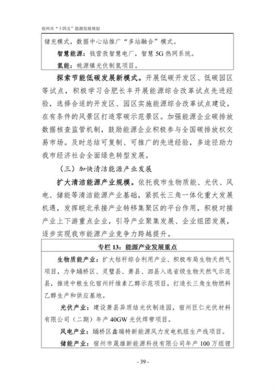 另外,《規(guī)劃》提出加快能源關(guān)鍵技術(shù)攻關(guān)和示范,支持新技術(shù)新模式試點(diǎn)示范。在儲(chǔ)能方面,依托宿州市全市儲(chǔ)能產(chǎn)業(yè)和儲(chǔ)能項(xiàng)目,開(kāi)發(fā)新型鋰電池產(chǎn)品,推進(jìn)儲(chǔ)能系統(tǒng)集成技術(shù)升級(jí),掌握大規(guī)模儲(chǔ)能電站設(shè)計(jì)關(guān)鍵技術(shù),統(tǒng)籌推進(jìn)發(fā)電側(cè)、電網(wǎng)側(cè)、用戶側(cè)儲(chǔ)能試點(diǎn)和商業(yè)模式示范創(chuàng)新,實(shí)現(xiàn)風(fēng)光火儲(chǔ)多能互補(bǔ)和源網(wǎng)荷儲(chǔ)靈活協(xié)調(diào)運(yùn)行。